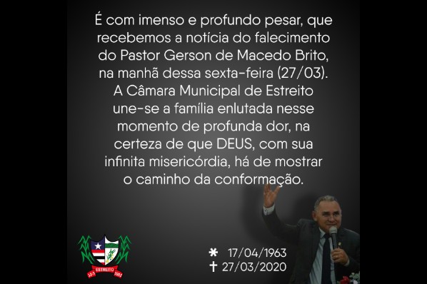 A Câmara de Estreito comunica a todos o falecimento do Pastor Gerson de Macedo Brito, na manhã do di...